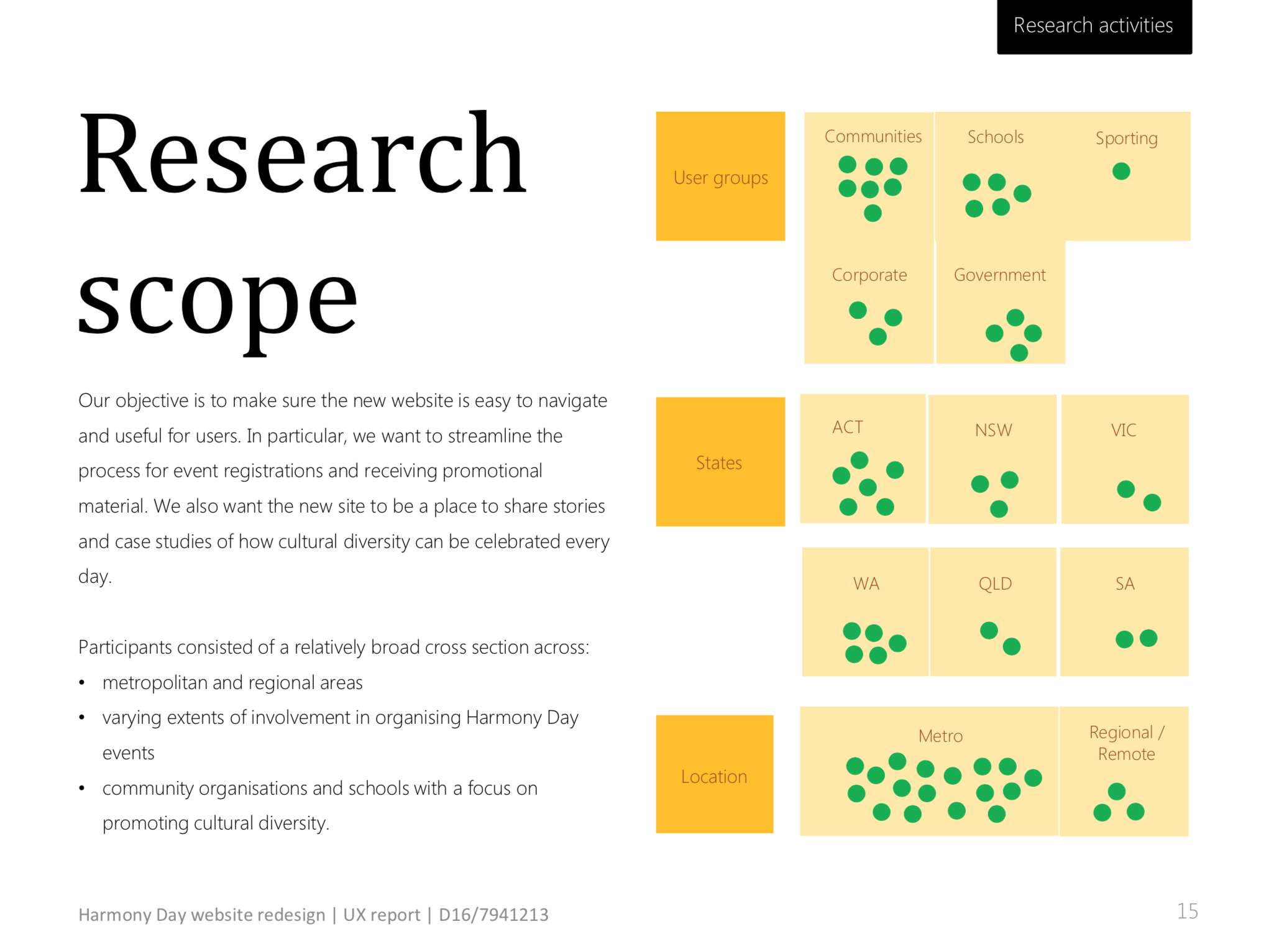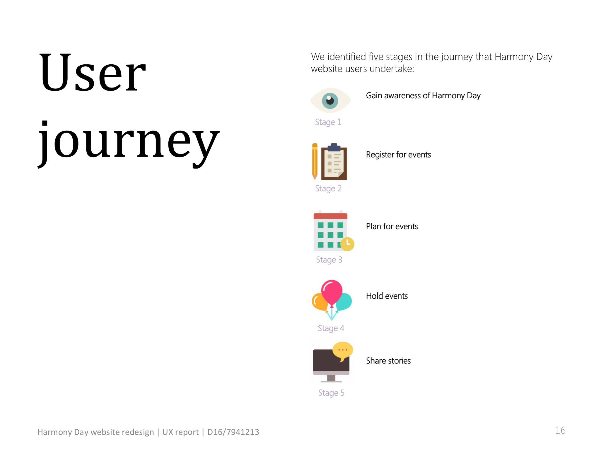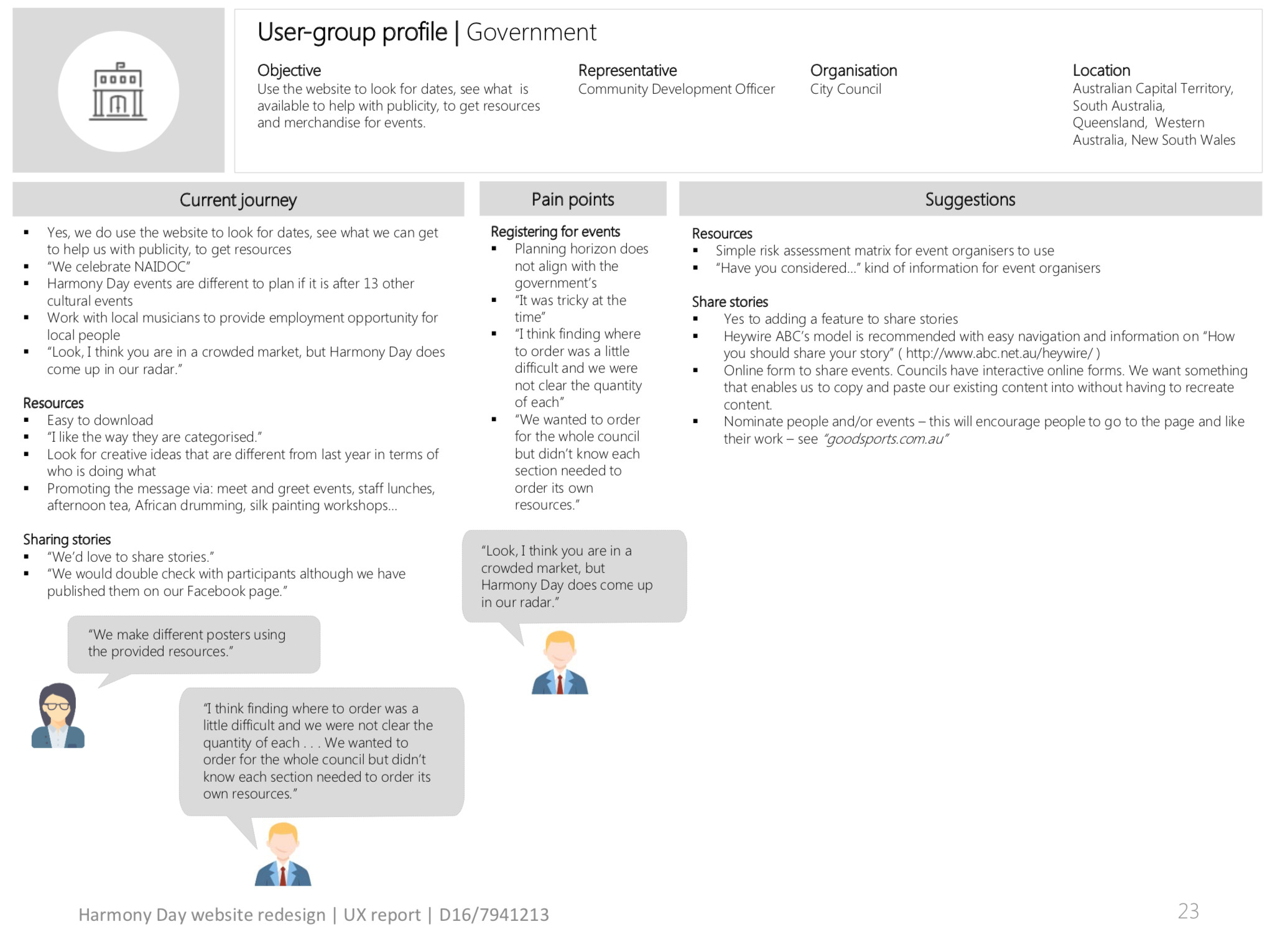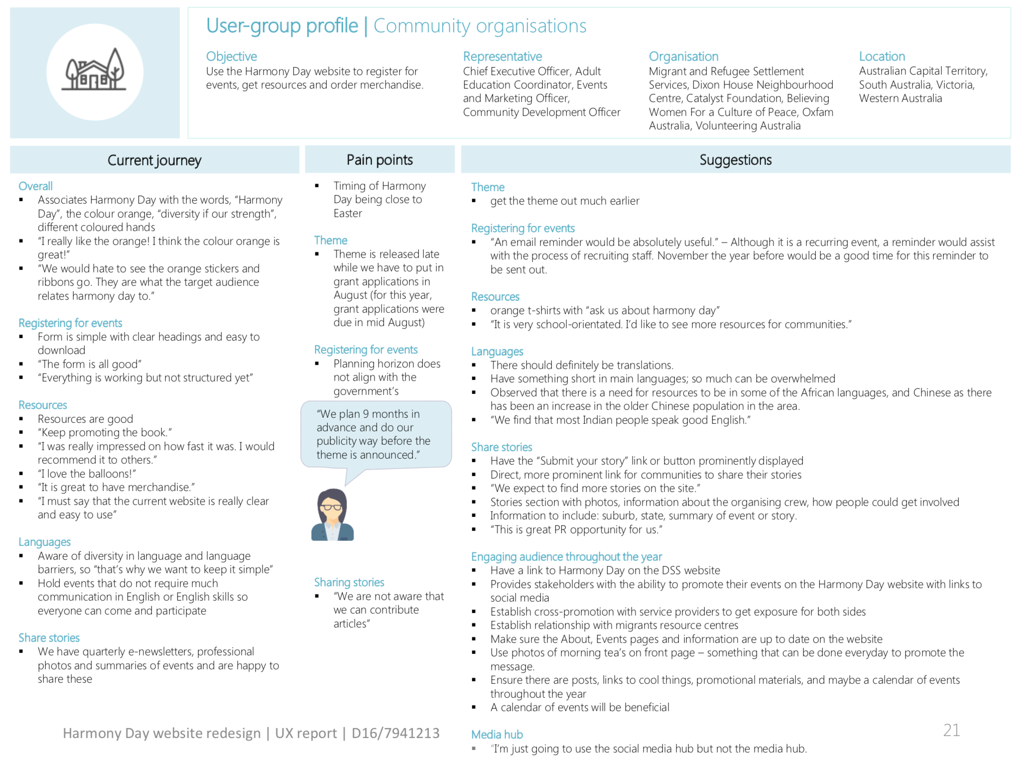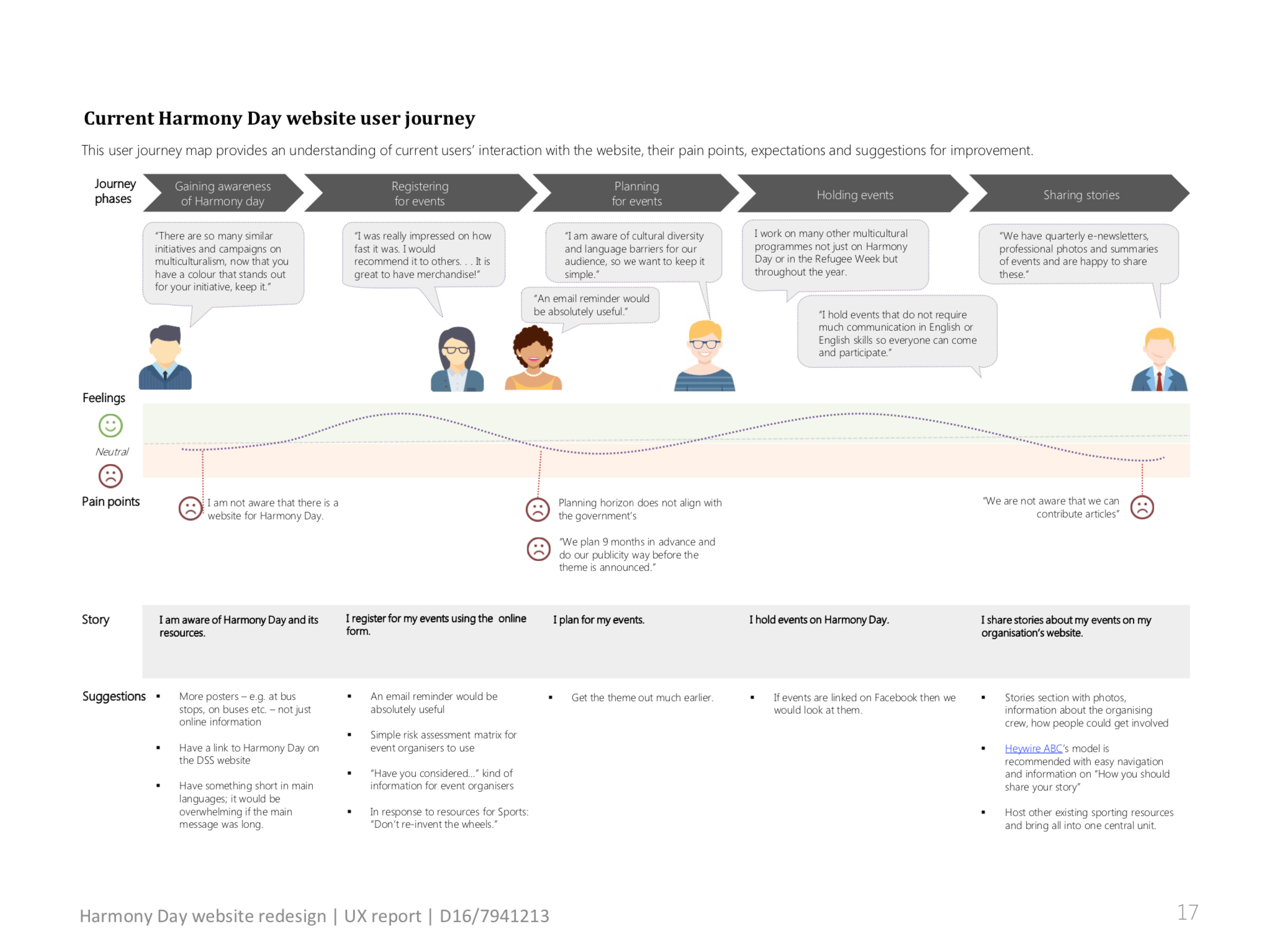 We built on shared insights from the Harmony Day 2016 Feedback Survey to further our understanding of how the current website engages with and assists users in participating in events.