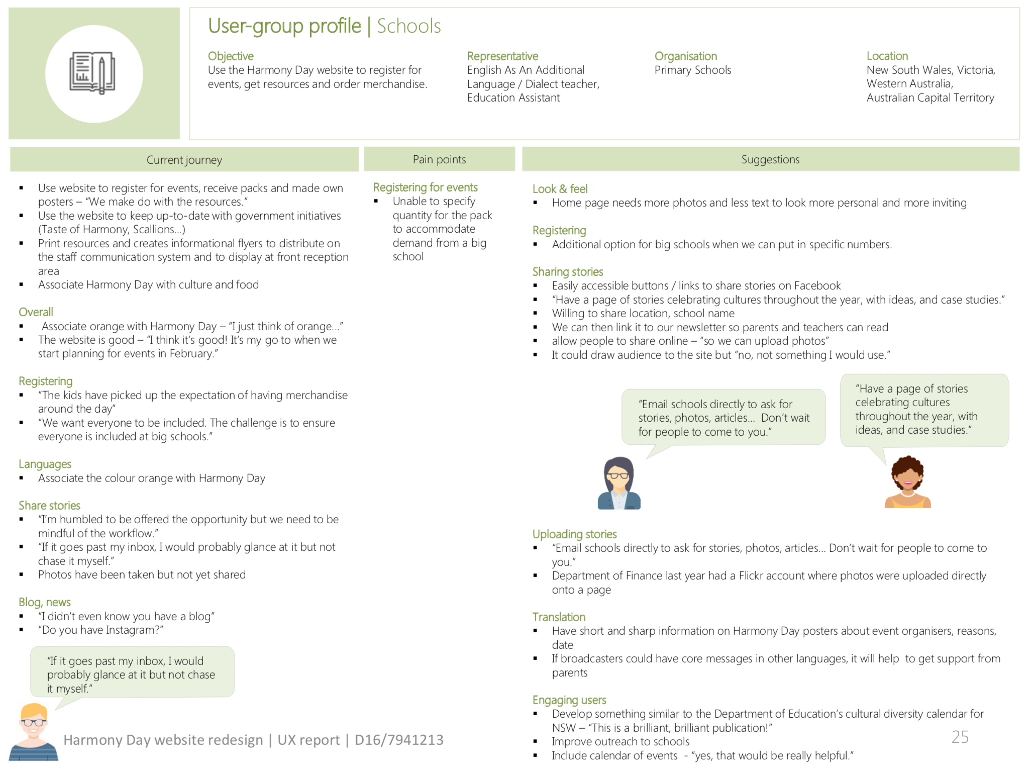 Shared insights from a previous research were used to design contextual interviews to further our understanding of user needs, with a focus on their current experience with Harmony Day’s resources and engagement methods, and suggestions to build stronger engagement throughout the year.