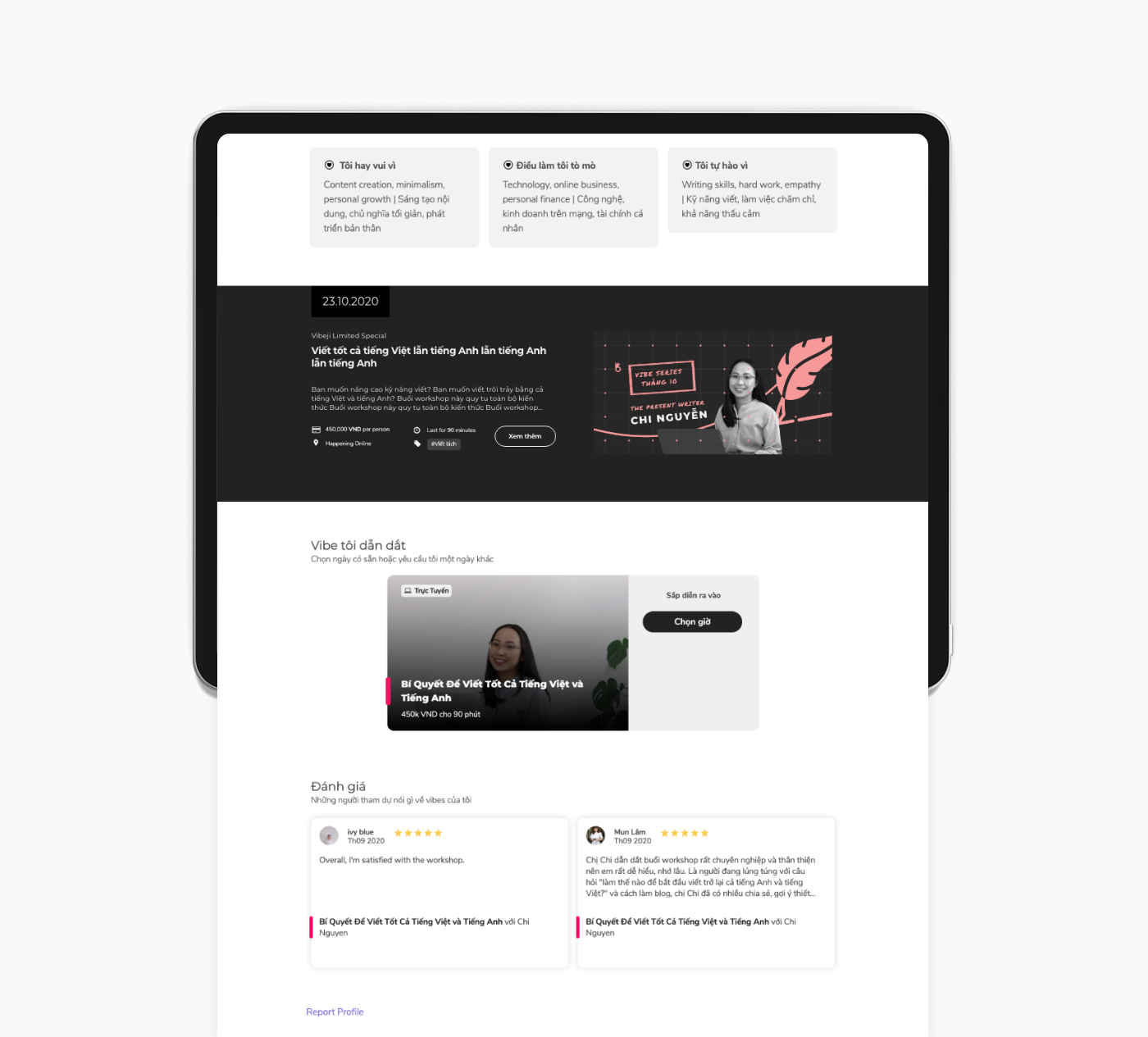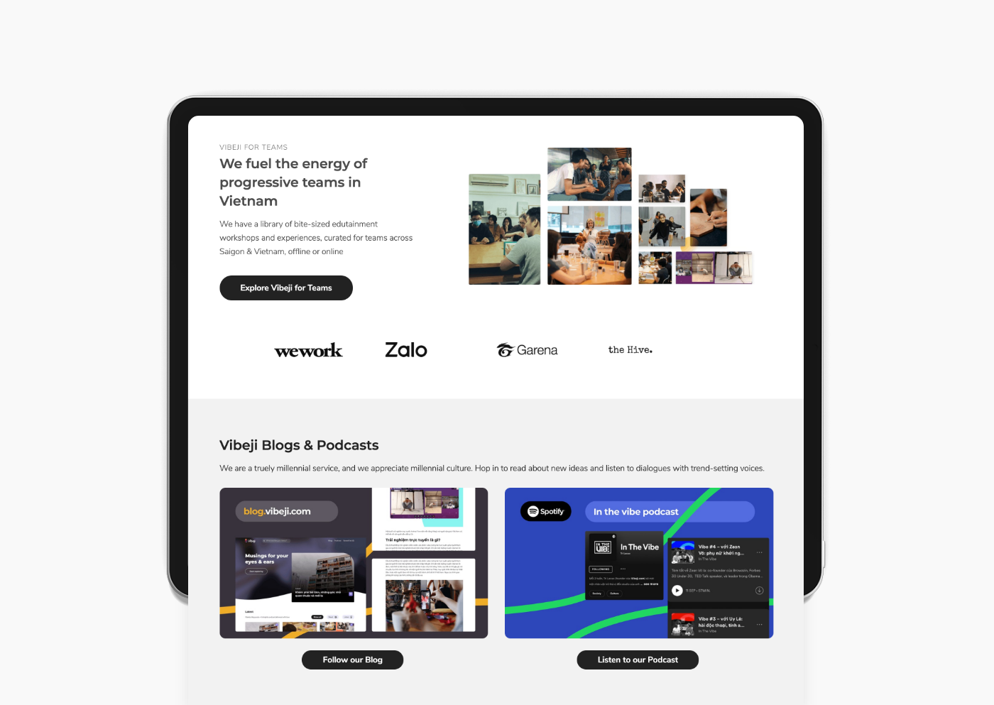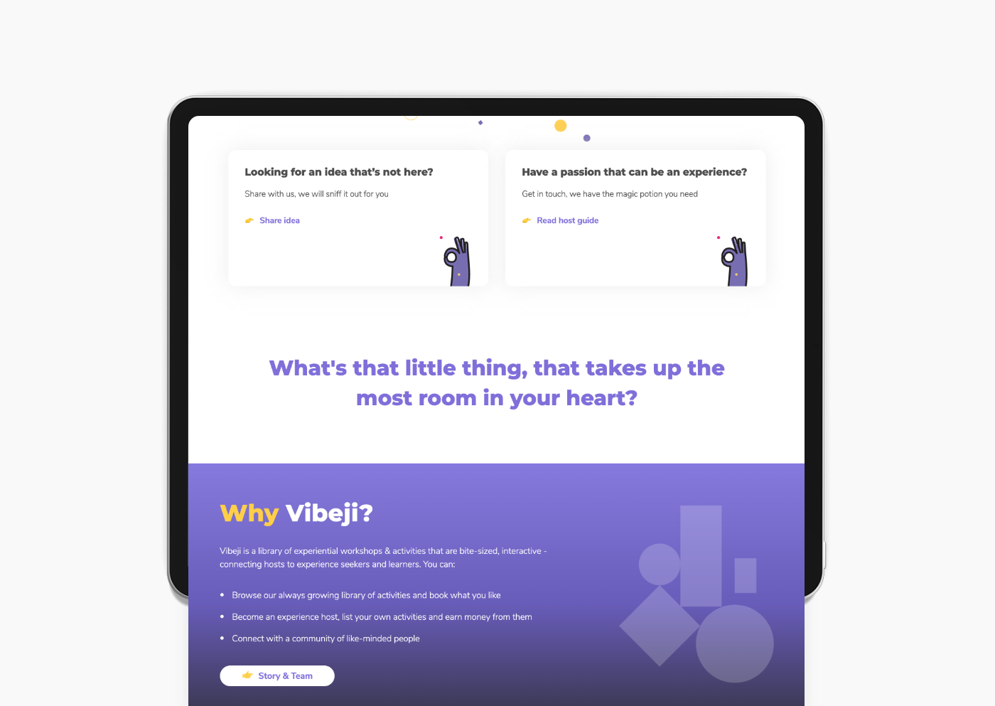 In March 2020, Vibeji focused on onboarding online workshops, launching ten virtual experiences. For this shift, I led significant visual branding, usability testing, and UI enhancement to ensure a seamless transition. Within 4 weeks, we went from 0 to 10 online experiences when we first launched our online collection at the end of March.