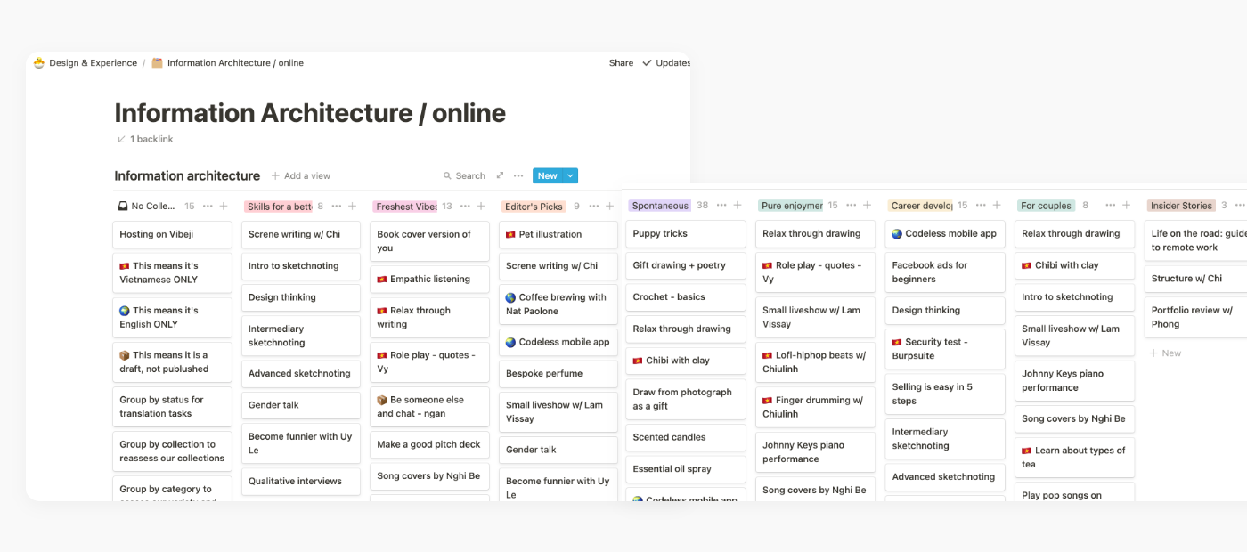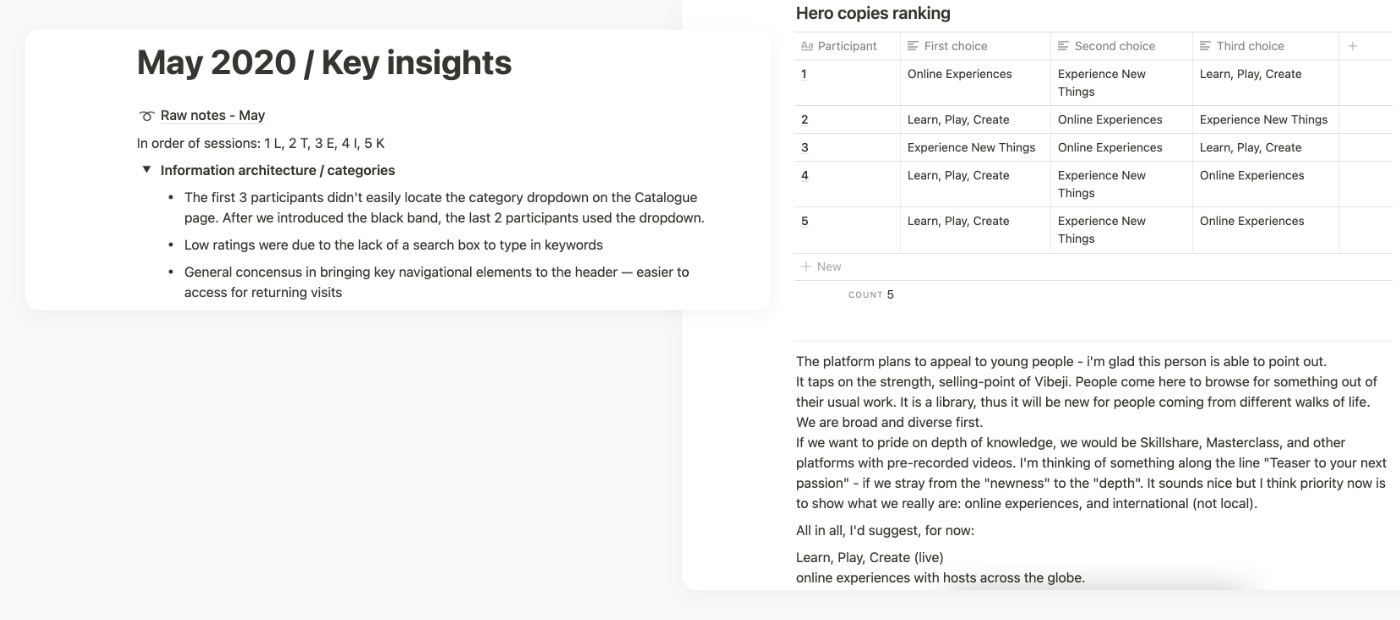 The team continued this momentum by speaking to existing hosts and provided support in creating a virtual version of their current workshops. I then created a Notion page to track our online inventory and, effectively, an important part of the site’s information architecture.