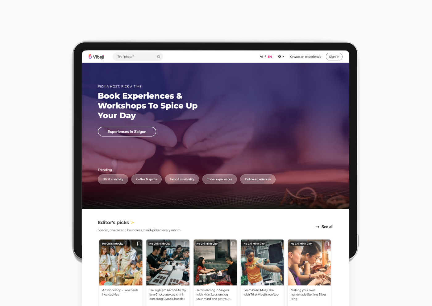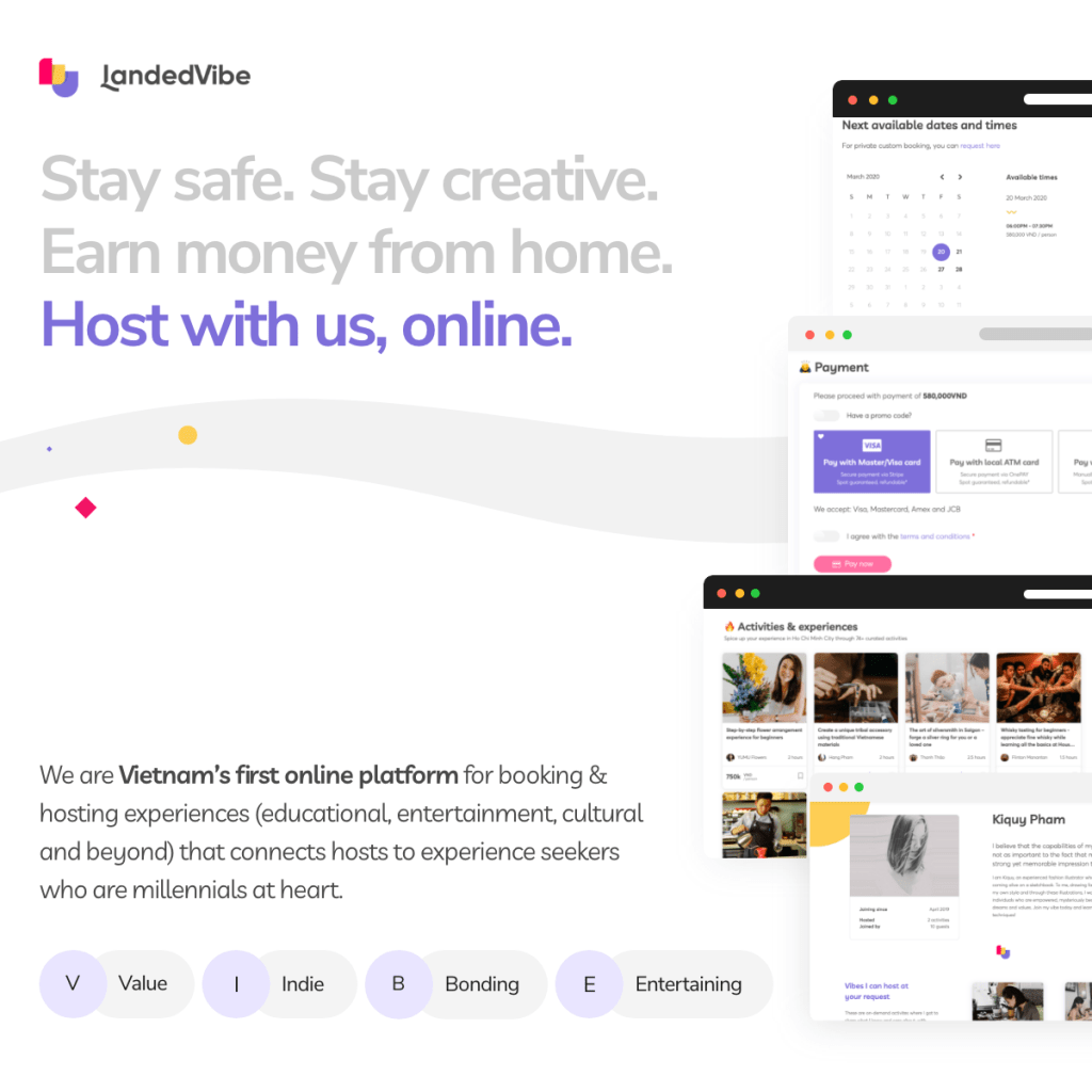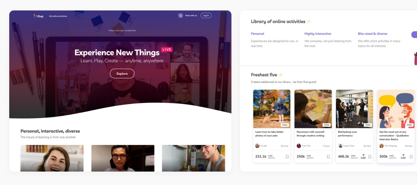 Vibeji.com is an experiential platform that connects hosts with experience seekers. Initially known as LandedVibe, it offered offline workshops but pivoted to online experiences during the COVID-19 pandemic.